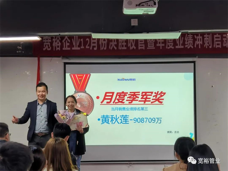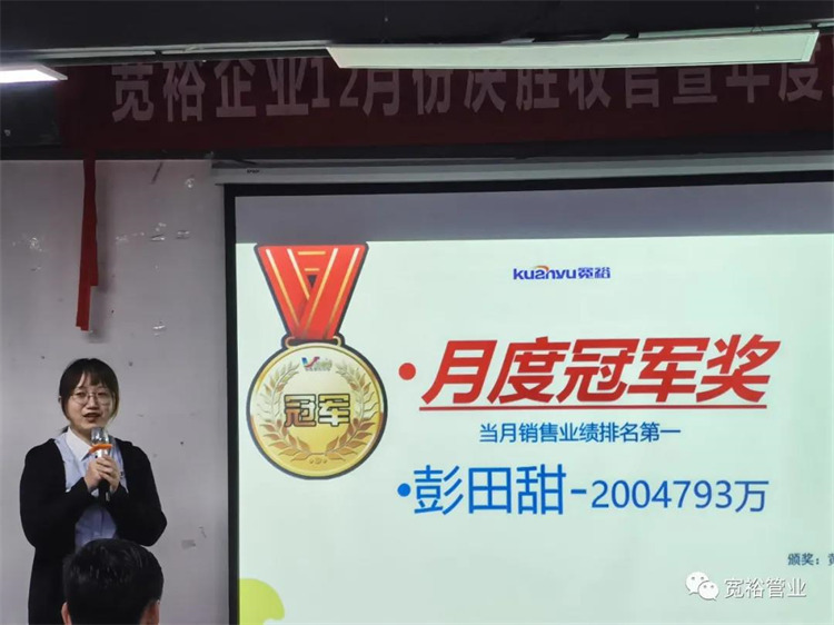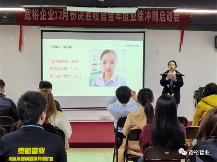 動(dòng)感滿滿的舞蹈之后正式開啟對(duì)12月1-13日的銷售業(yè)績回顧,并對(duì)個(gè)人銷量前十、團(tuán)隊(duì)業(yè)績完成情況、團(tuán)隊(duì)PK情況等進(jìn)行了總結(jié)。在過去的13天里,已經(jīng)涌現(xiàn)出了多位優(yōu)秀的將士,他們分別是以100%業(yè)績率先沖刺的00后新生代“小莊”,還有首個(gè)拿下本月25萬大單的小斯---從跟單員通過不斷的努力成為優(yōu)秀的銷售工程師。更有通過前期不斷積累了成功開拓經(jīng)驗(yàn)的來自無敵隊(duì)的小黃,12月至今已經(jīng)開發(fā)了6個(gè)新客戶,現(xiàn)場(chǎng)更是迎來了“哇塞”的喝彩聲一片!在此小編也僅代表寬裕管業(yè)對(duì)各位優(yōu)秀戰(zhàn)士的優(yōu)異成績表示大寫的點(diǎn)贊!你們是最棒的!